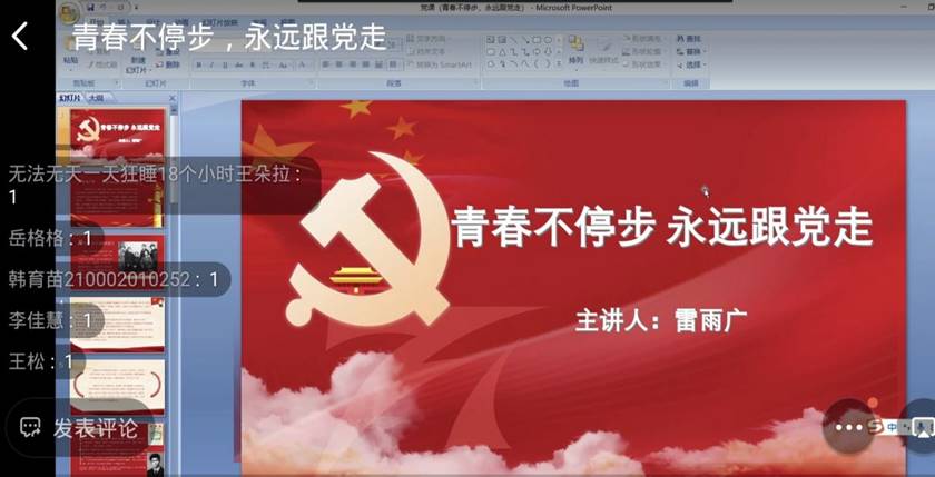 为了促进同学们对入党知识的了解,引导同学们正确地看待入党问题,明确党员要求。日日摸夜夜爽于2022年4月12日晚通过钉钉平台举行了“青春不停步,永远跟党走”线上主题党课活动。此次党课由日日摸夜夜爽党总支书记雷雨广主讲,21级积极分子聆听了此次党课。
