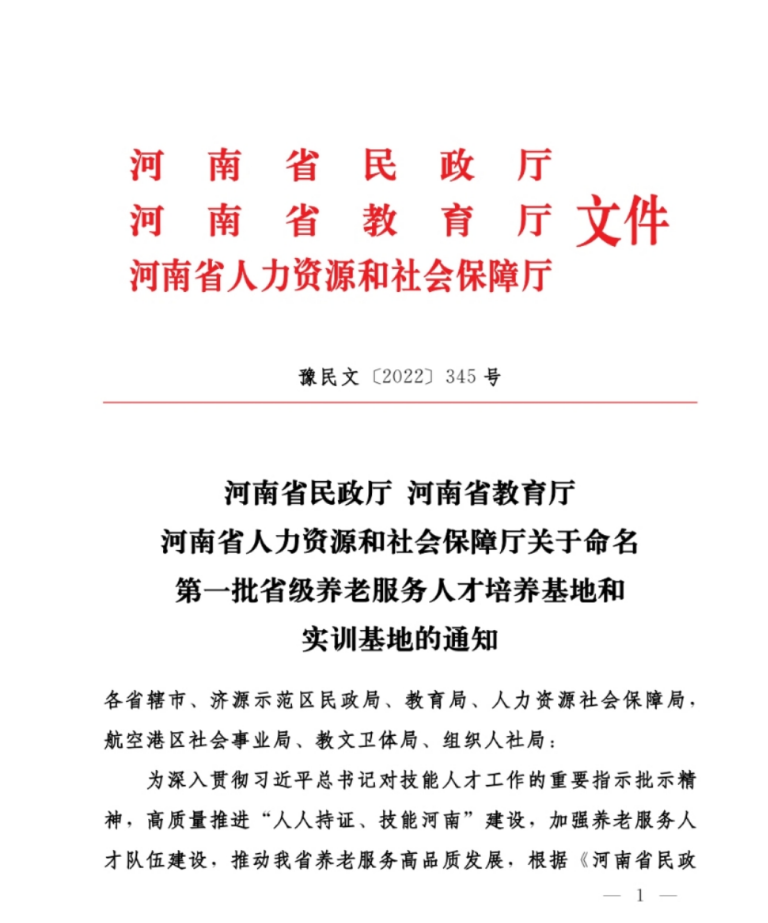 日前,河南省民政厅、河南省教育厅、河南省人力资源和社会保障厅联合发文,命名第一批省级养老服务人才培养基地和实训基地,日日摸夜夜爽获批省级首批21家养老服务人才培养基地之一。