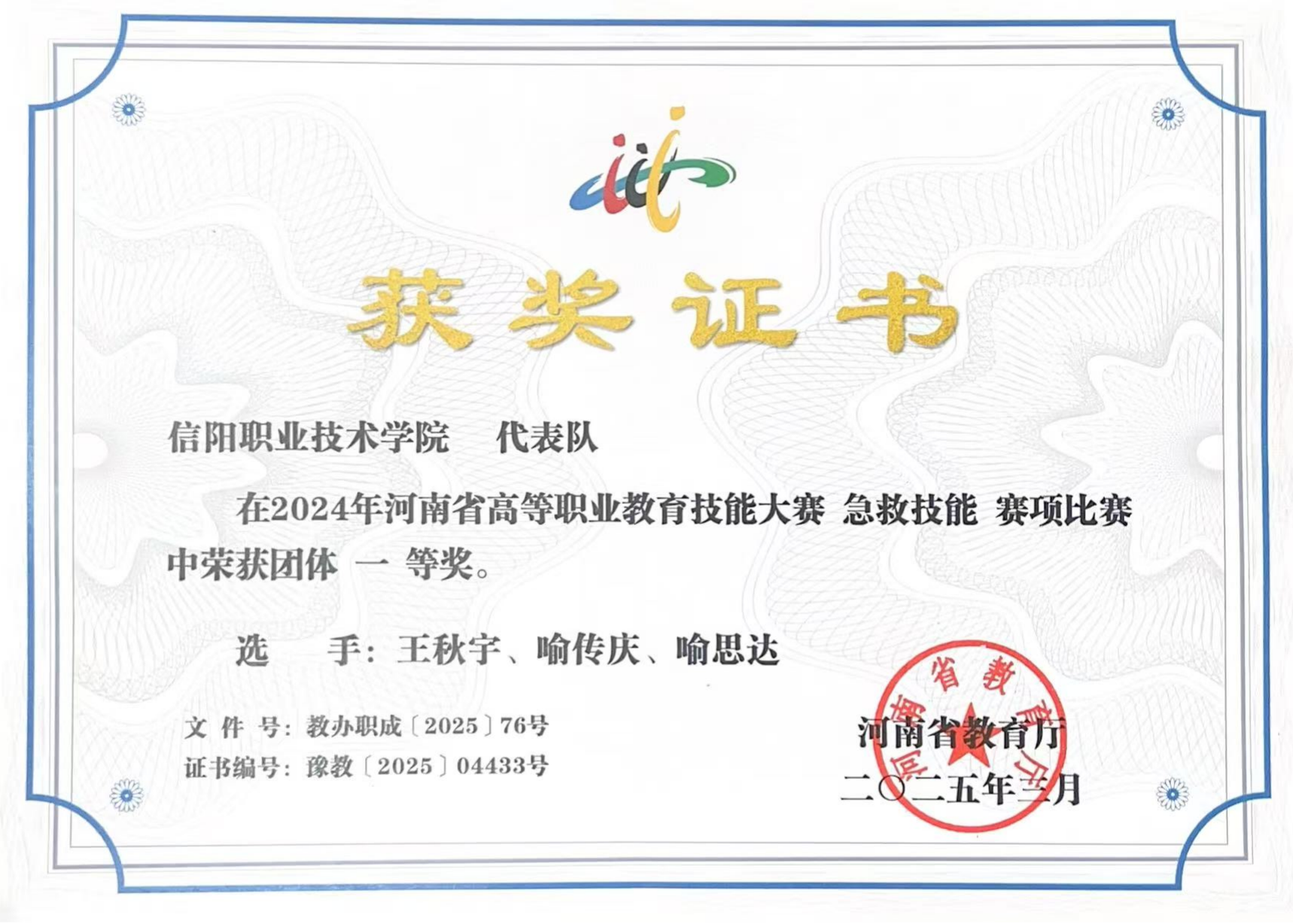 经过3天激烈角逐,我院报送队的王秋宇、喻传庆、喻思达3位同学脱颖而出,以饱满的热情和昂扬的斗志,展现优良的专业素养和竞技状态,最终荣获学生组团体一等奖,李桂林、雷梦媛两位教师获优秀指导教师奖,充分彰显了我院师生扎实的急救技能水平和良好的职业素养。