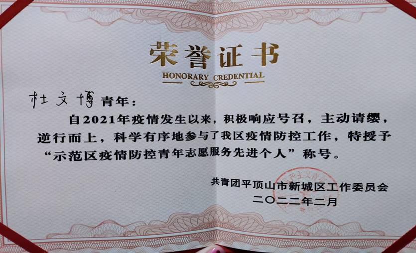 志愿感悟:我很骄傲在未来能够成为一名医护人员,也很荣幸能够参加抗疫志愿活动。我认为能够尽自己所能服务社会是一件十分值得高兴的事情,在参加疫情防控服务期间,众多繁杂的事物让我感到疲惫,而我炽热的心告诉我必须坚持下去,我的城市此时此刻需要我的付出。如果不是亲身经历就体会不到一线人员的艰辛,零下的天气,寒风呼啸,恶劣的工作环境考验着每一个人,但我没有看到任何一个人退缩,每个人依然坚持自己的岗位,不曾有半句怨言,其敬业的工作态度让我肃然起敬。在服务的同时也学习到了更多关于疫情的知识,也更全面的了解了防控疫情的重要性,这是我在书本上学习不到的宝贵知识。我希望在未来能有更多青年投身于社会服务中,让更多的人见证“00后”的力量,点点微光,聚而成炬。在未来我也会用一颗赤热的志愿服务之心,同众多防疫志愿者一同努力,为人民和谐安定的幸福生活保驾护航,为我的国家筑起一条防控疫情的坚实防线!