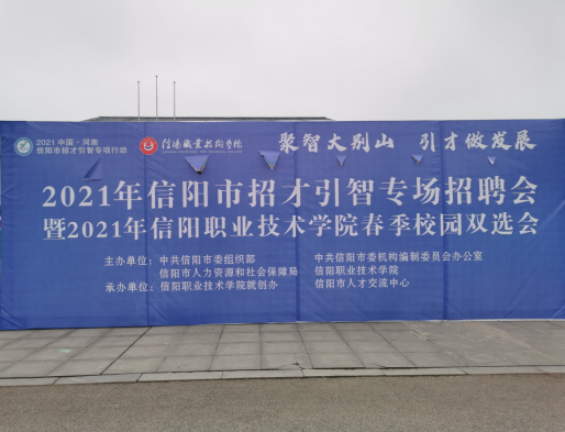 为进一步做好我校2021届毕业生就业工作,坚持“就业第一,以市场为导向促进就业”的指导方针,促进各类人才与市场有效对接,我校于4月24日上午9时在明德广场举办了2021年信阳市招才引智专场招聘会暨2021年信阳职业技术学院春季校园双选会,其中固始县中医院、广东省珠海市美业协会和深圳市巨邦科技发展有限公司在我院举行了专场招聘会。