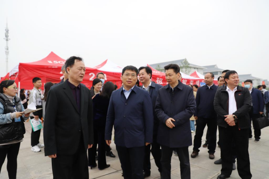 市委副书记、市委统战部长王新会,市人社局党组书记、局长李东升,市委组织部副部长孙杰,市委宣传部副部长余金霞,市政府副秘书长胡正友,市委编办副主任付堂启,市人社局党组副书记、副局长朱恒,党组成员、市务工办主任胡全增,党组成员、市人才交流中心主任周晴一行亲临会场指导工作。学校党委书记杨良新、副校长王豪、副校长郑延芳、就业指导办公室主任黄太国到现场调研,了解学生实习就业情况,征求用人单位在人才培养方面的意见建议。