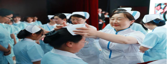前辈为护理新生戴上圣洁的白色燕尾帽,护理新生接过前辈手中代表着传承奉献的红烛。闪烁的红光代表了护理新人将为护理事业奉献的决心。