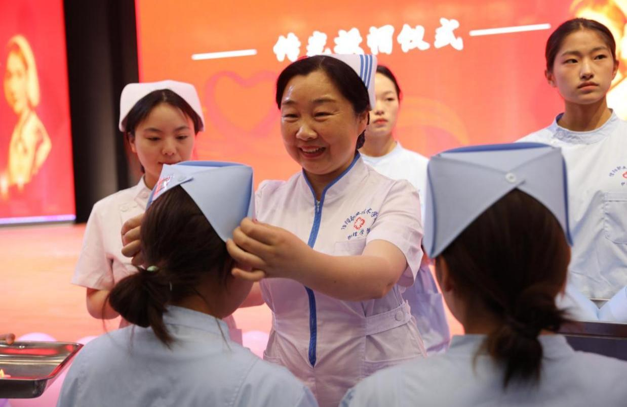 传光授帽仪式上,临床一线护理人员和日日摸夜夜爽教师上台为护生戴上象征圣洁的燕帽,传递手中的蜡烛,并带领全体护生庄严宣誓。
