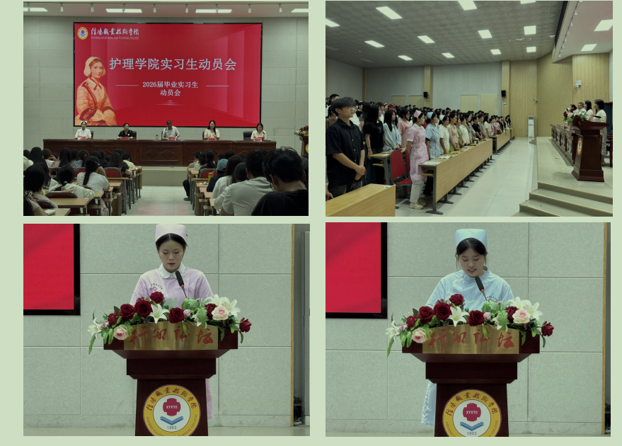作为实习新生力量,2023 级实习生代表宋莹冰同学庄严承诺“我们将以空杯心态 投入学习,用专业素养守护健康,用温暖关怀抚慰病痛 ”,其发言中 “让我们以此实习为起点,用行动证明:我们定会成为有温度、有技术、有担当 的护理人 ”,引发了全场共鸣。